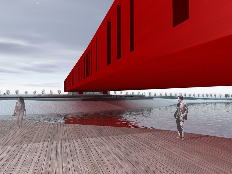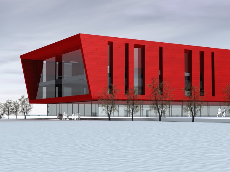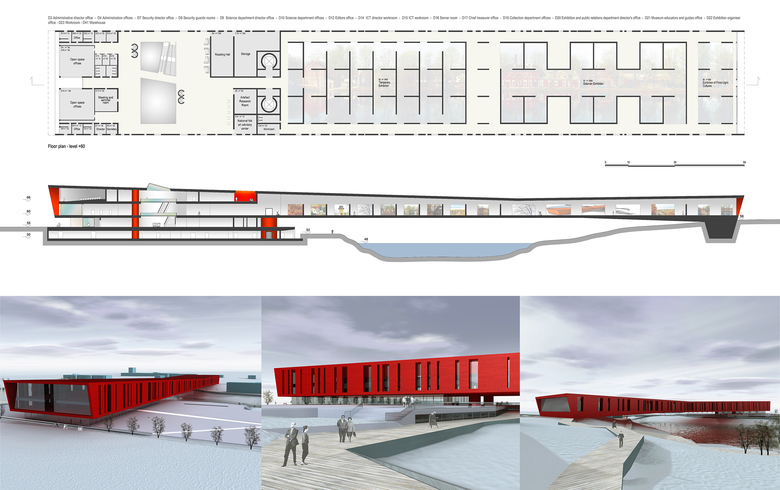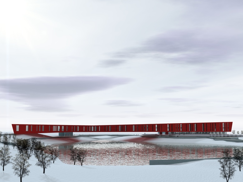 The project has been designed for an international competition for the new Estonian National Museum in Tartu. The project proposal is to consider  the building as a landmark: the museum develops longitudinally with a simple and clean volume, consisting of a long cuboid crushed in the middle to increase the slenderness of prospects.