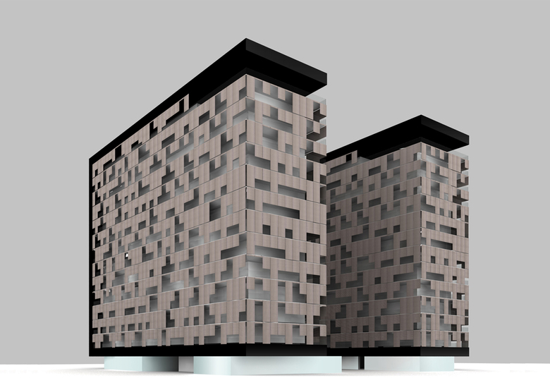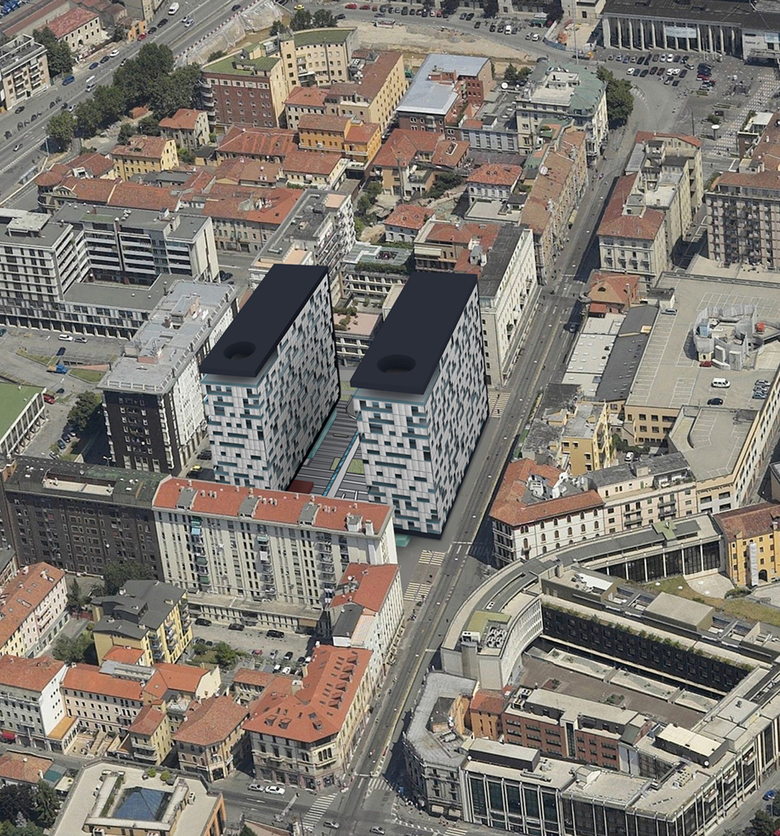 The project includes the demolition of an existing building, dating from the early ‘60s, and the reconstruction on the same parcel of two energetically sustainable buildings with anti-seismic structure. The permeability of the buildings at the ground floor, guaranteed by pedestrian paths crossing the site, creates new spaces of social aggregation -public square- and a new green space in a heavily built area. The orientation of the buildings allows having the two long fronts facing east and west, a short blind north front and a south front open toward the city. The three open sides, defined by a curtain wall, are drawn back from the thread of the attics projecting a constant shade. The solar radiation is prevented by the building second skin, made of metallic rolling-up fabrics placed at the external limit of the attics. The space between fabrics and glass front creates a hybrid space, a covered but open terrace, whose depth can vary from a minimum of 1,50 m to a maximum of 2,50 m. The physical façade limit, made by all-height glass doors, is movable: this system allows to guarantee an inner bigger space during winter and to add more space to the terrace during summer, according to the weather. Internal volumes - sort of boxes containing toilets, corridors or distribution fixtures - allow a rational layout and the functional specialization of its spaces. These boxes have a precise formal characterization being covered with a customizable tensioned backlit textile. Each building block has two cores containing vertical connections (stairs and elevators), responding to anti-seismic standards and allowing to reach a rational layout and plant optimization. The internal design is guided by principles of spatial rationality, use of natural light and ventilation. Particular attention is paid to energy efficiency thanks to plan orientation, double skin, sunlight protection, use of renewable energy sources (geothermal and solar).