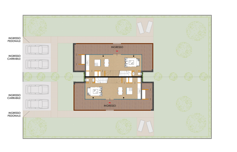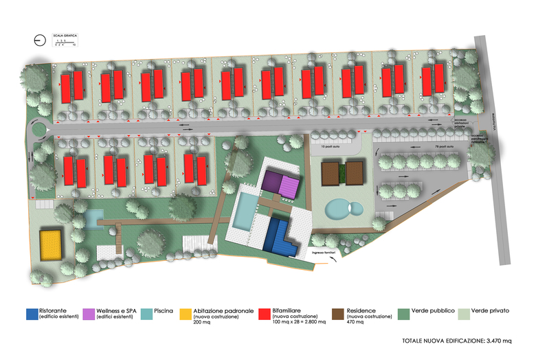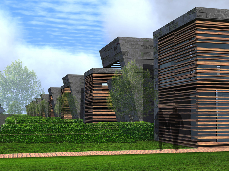 NBD Country Complex purpose is to realize single family residences in a privileged area, at the base of Colli Euganei Natural Park, enjoying the benefits of country living and contemporary comfort. A group of eight residences is reunited in a two floors building, close to the complex facilities such as a SPA and a wellness area, a swimming pool and a restaurant. Other 28 two floors single family residences, divided in 14 pairs, are spread all along the area and allow the guests to enjoy the natural landscape, thanks to their private gardens. Facades are covered by a second skin made of wooden brisoleils that allows interior privacy and countryside view at the same time.