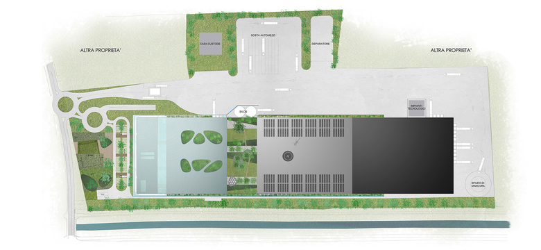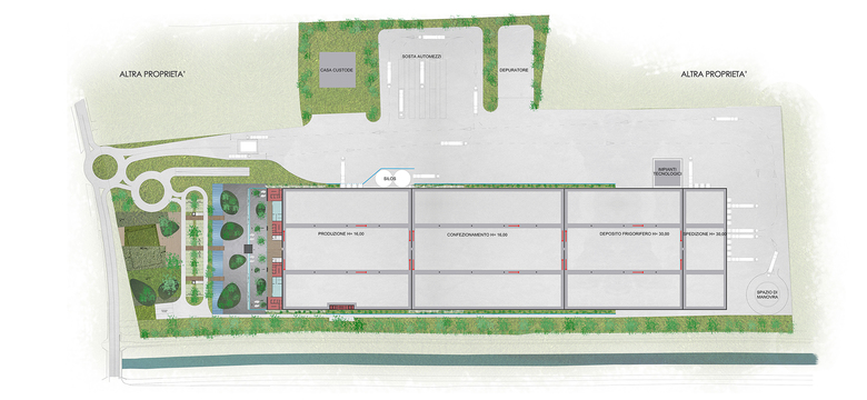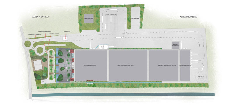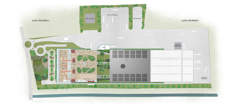 The project involves the construction of a new production and business building for a company operating in the organic and vegan food sector. An important part of the project is the inclusion of public spaces, with exhibition spaces and laboratories, rooms to taste products, an auditorium and a retail with reserved parking spaces at the ground floor. A canteen with a café is reserved for factory workers and employees and also a large car park at the basement. Laboratories for research and development of new products are located close to the executive offices.