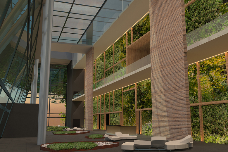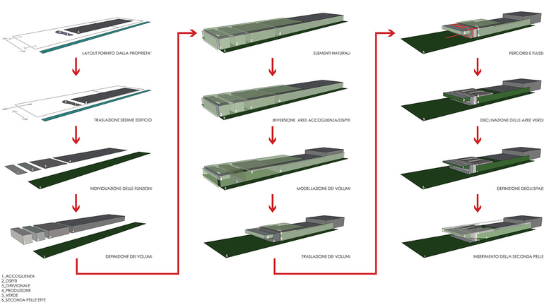 The revolutionary aspect of the composition is that the two functions - directional and productive – are not placed side by side but the two volumes are physically overlapped. The offices are located above the factory itself, whose coverage has turned into a roof garden with wide spaces dedicated to smart working, integrating recreational and business functions. Large areas dedicated to host the guests are located in the prominent part of the building above the entrance. The heart of the whole structure is a large glass triple-height lobby that switches the flows in the various levels and sectors of the building.