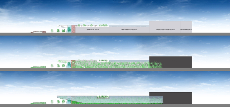 The design theme is the integration of architecture and nature that surrounds and permeates the entire building. Offices, laboratories and canteen face the green roof and offices have also been provided with masted courts as green lungs. The outdoor area below the large overhang is thought as a sensory journey, an aromatic garden that serves as the first stage for the discovery of food products. Nature is also the protagonist in the glass hall, which protects the vegetation like a gigantic greenhouse, and all around the building, where the green embraces the entire structure.