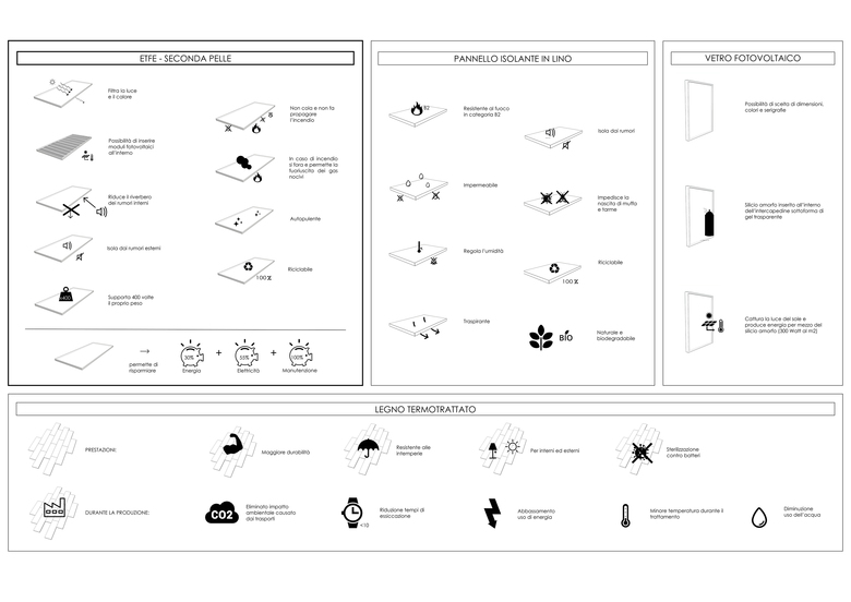 A double etfe skin envelops the perimeter vegetation creating a protected green path that pleasantly leads to the production area through the exterior. Etfe is a material that guarantees high technical performances, it has been studied for this project to protect the building from excessive radiation and to have inserted, directly between its panels, photovoltaic modules. The entire building has been designed for maximum efficiency and at the same time to satisfy the environmental sustainability criteria: etfe is a recyclable material to 100%, the insulation is made of fully biodegradable linen panels, the wood choosen is thermo-Treaty, which enables high performance greatly reducing the environmental impact.