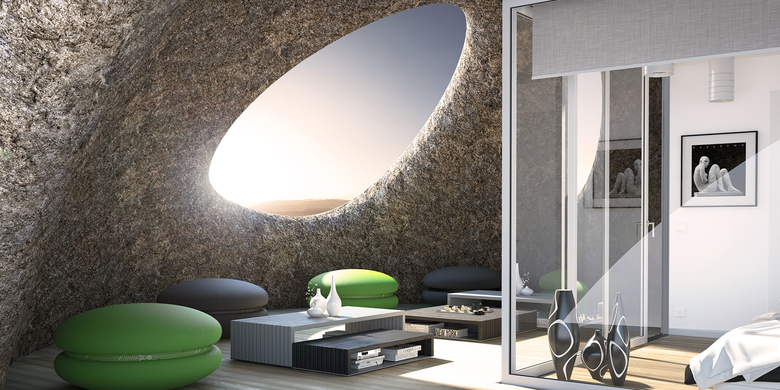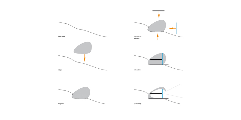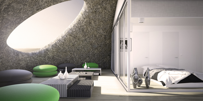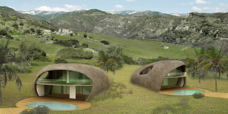 Although it reproduces a natural element, the artificial character of the architectural design is shown by the technological materials (glass and steel) and the constructive choices. Pebble Houses will be eco-friendly and will have a high energy efficiency. The bond between architecture and natural environment is well expressed by their shape. Placed on a hill, the two unities adapt themselves to the ground geo-morphological characteristics. As a result they looking like two big rocks, perfectly integrated with the environs. The orientation of the two buildings allow at the same time privacy and a wide view to the sea. The Pebble Houses are identical to each other. They have two levels and a total floor area of 209 sqm. At the ground floor we can find the kitchen and the living area, at the first floor two single rooms and a double one. The large French windows placed at the front provide air and light to the three rooms at the first floor. Thanks to them you can enjoy the beautiful surrounding landscape. The large terrace (55 sqm) stretches toward the sea providing a porch at the ground floor. The shell has two holes on the top which give light and air to the internal spaces and a large side opening where the terrace is. The building has a floor heating. An automation system measures the thermal conditions and, setting the ventilation, guarantees stable and uniform climatic conditions.