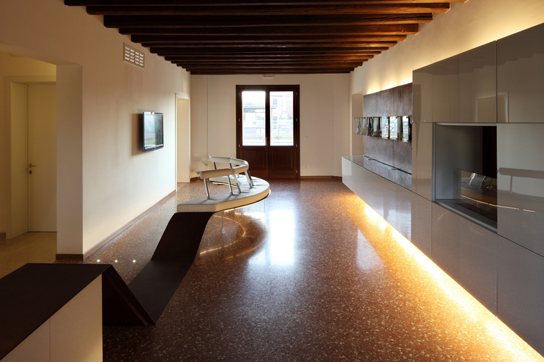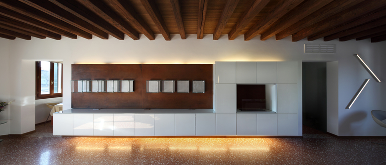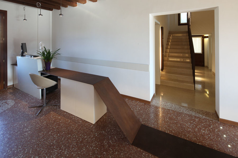 The traditional “terrazzo veneziano” floor identifies the great lounge at the ground floor where a contemporary auburn steel stripe guides the guest to the recepion throug the hall.