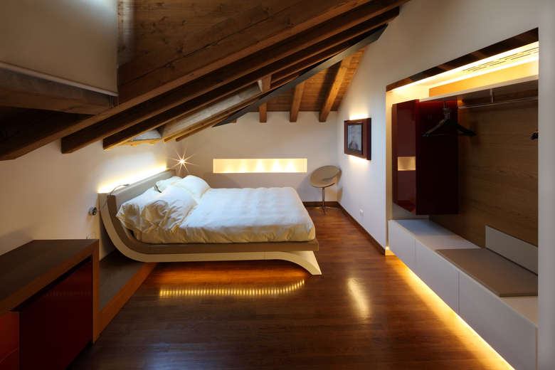 Traditional use of light is minimized. The project choice is to integrate lighting in the interior design: strips and spots lights underline and model the space and the continuous curves of the furniture.