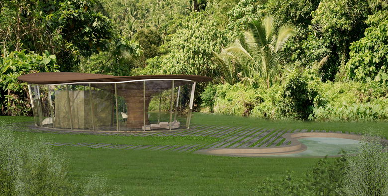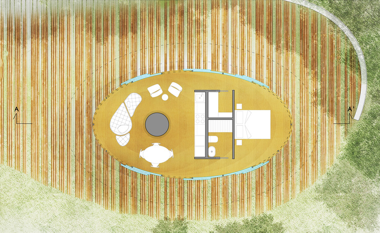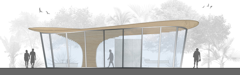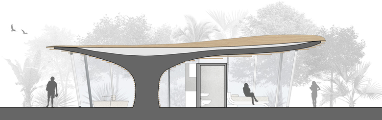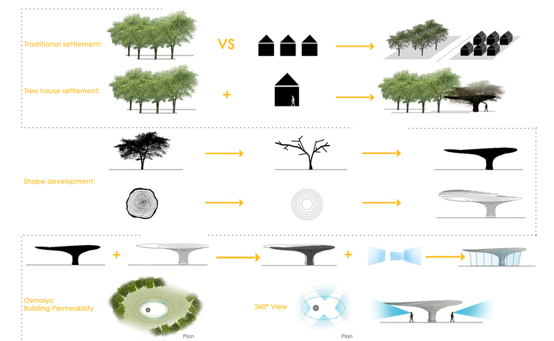 Compared to traditional settlements, where buildings contrast with green space, Tree House wants to relate to natural environment by inserting like in a camouflage. Nature becomes a source of inspiration for the architectural volume, but not slavishly imitated: a single point of support, expanding at the top as a large trunk, supports the roofing, that moves freely in space as the foliage of a tree. Parallel bands encircle the whole volume, starting first horizontally, then with free curves following the roofing that develops in space with an irregular shape.