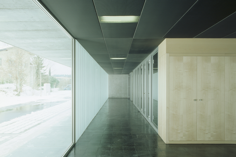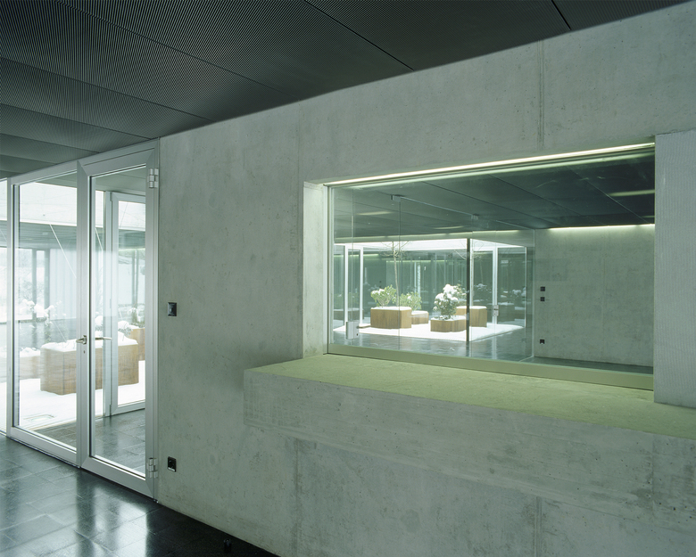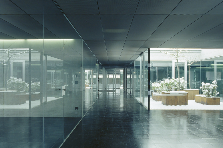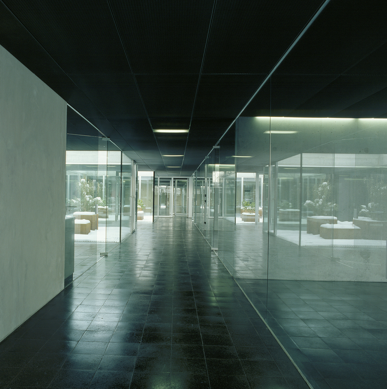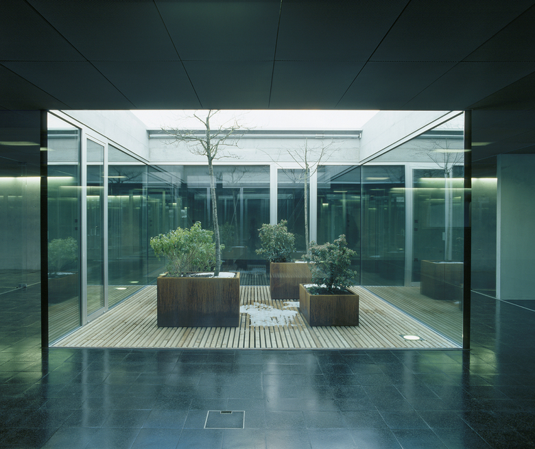 Das darüber liegende Bürogeschoss ist introvertiert, die Aussenfassaden sind mit wärmegedämmten Profilitgläsern ausgefacht und lassen ein milchiges, diffuses Licht eindringen. Der Blick wird so auf die fünf zentralen, nach unterschiedlichen Themen begrünten Innenhöfe gelenkt.