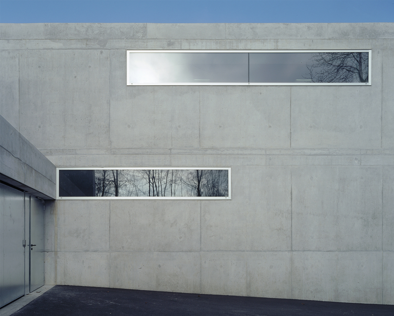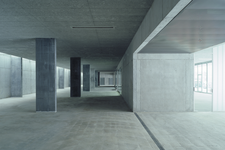 Die Halle im Sockel wird als Werkstatt resp. befahrbare Lagerhalle benutzt. Die vorfabrizierten, tragenden Betonscheiben rhythmisieren das riesige Volumen. Die wechselnden Lichtstimmungen umspielen diesen Grundrhythmus melodisch. Die Halle wirkt roh, reduziert. Die Garderoben- und Besprechungskuben sind als massive Betonkörper in die Mitte der 21m tiefen Raumzone gestellt. Raumunterteilungen zwischen den Werkstätten sind als lichte Wände in Profilit ausgeführt, so dass die Halle als Einheit spürbar bleibt.