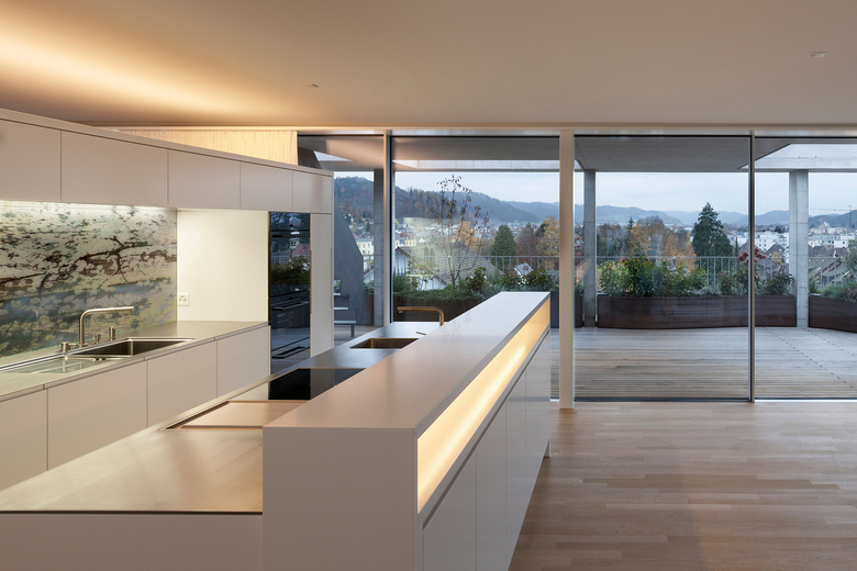 Die ehemalige Hauswartwohnung auf dem Dach dient nach wie vor dem Wohnen und Rückzug, wurde aber räumlich komplett umgedeutet. Dem Wunsch des Bauherrn entsprechend wurde die kleinteilige Zimmerstruktur ohne starken Bezug zur Terrasse zugunsten eines grosszügigen Raums für die Bewirtung von Gästen aufgehoben. Ähnlich wie im Schaulager das Archivs zoniert die Küche den Raum in einen Schlafbereich mit kleiner Ankleide und einen grösseren Wohnbereich. Über grossformatige Glasschiebetüren erweitert sich der Raum auf die Terrasse, der herbe Charme des Gewerbegebiets am Gleisfeld, die unmittelbare Nähe zum intakten Altstadtkern von Zofingen und eine grossartige Fernsicht auf die Berner Alpen werden zu prägenden Elementen der ganzen Wohnung. Das neue Dach fasst die Terrasse räumlich und wertet sie zum eigentlichen Aussen-Wohnzimmer auf.