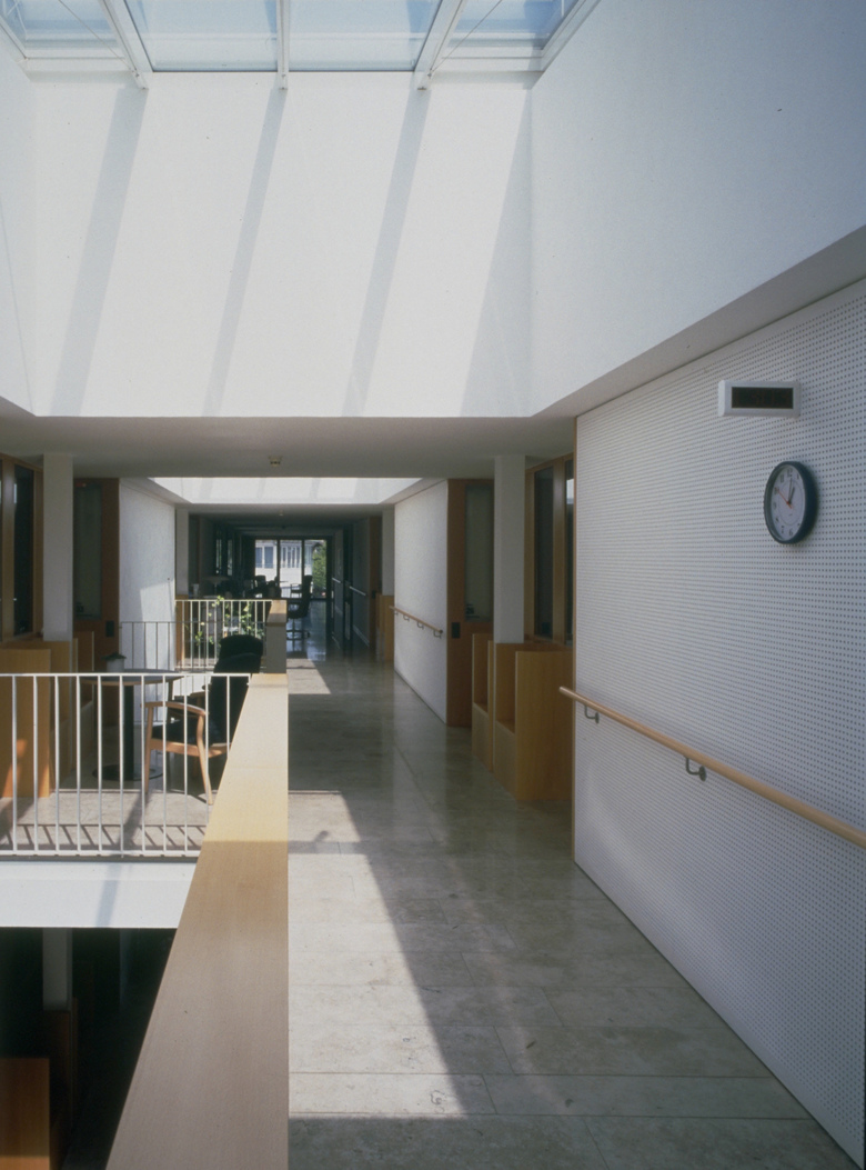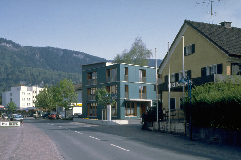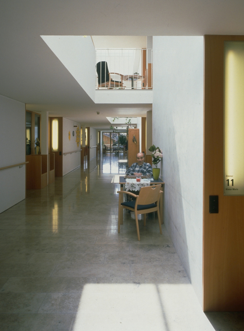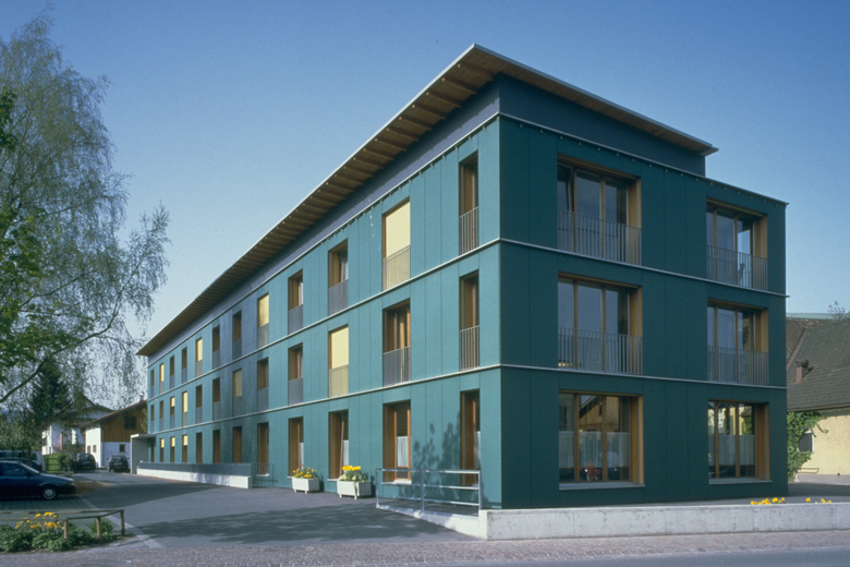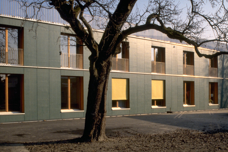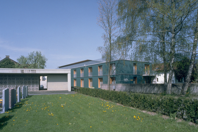 Der parallel geschichtete Baukörper integriert das grosse Volumen gut in die Umgebung. Er schafft auch neue öffentliche Aussenräume und Wegverbindungen zwischen dem Einkaufszentrum an der Hauptstrasse, der Kirche, dem Gemeindehaus und der Volksschule. So erhielt der disperse Ort eine neue Mitte, die auch vielfältige öffentliche Nutzungen einschliesst. Das Gebäude selbst ist modular strukturiert und dadurch äusserst flexibel brauchbar. Analog dazu gibt es nur einen Fenstertyp, raumhoch, innen angeschlagen, beide Flügel können voll weggeklappt werden. Die Korridore werden im Sommer zu offenen Veranden. Aussenwände in Ziegel und Beton; vorgefertigte Sanitärstränge in Leichtbeton; Niedrigenergiehaus mit Erdwärmespeicher, kontrollierte Be- und Entlüftung, Solaranlage.