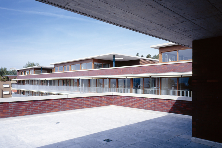Mit dem durchlaufenden Balkon wurde durchgesetzt, das Werk auf seiner Gartenseite ebenfalls mit der grössten Abmessung zur Geltung zu bringen. Hier gibt es das enge Zusammenwirken der Wohnräume mit der davorliegenden Terrasse. Wie der Flur wirkt auch sie mit ihrer Zwischenlage in mehrfacher Hinsicht vermittelnd. Frontal geht das aus der Wohnung über den weiten Gartenraum zur noch weiteren Sicht ins Tal und der Ausrichtung auf die Sonne. Lateral also quer dazu, verbindet die Terrasse die Zimmer und ihre Bewohner unter sich auf dem zweiten Weg, der aussen rum führt.