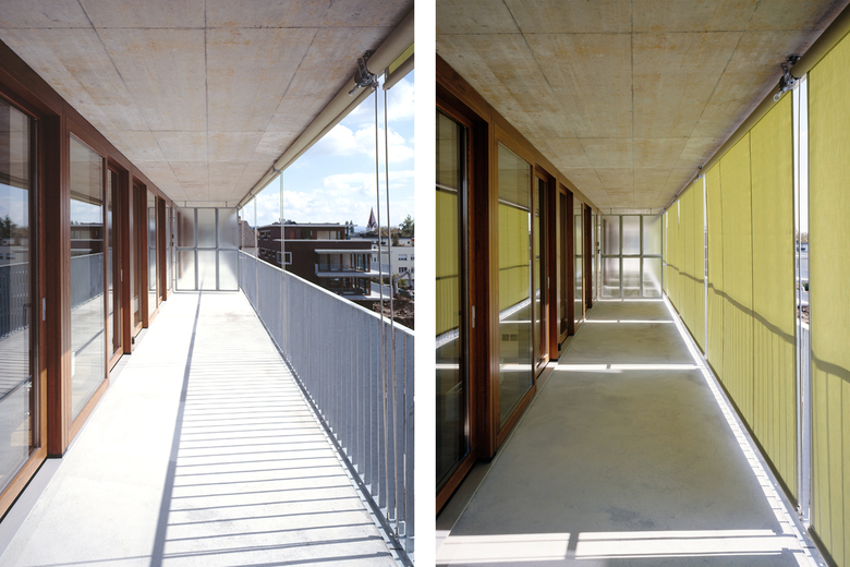 Der Wohnungsbau hat das Merkmal der Kleinteiligkeit. Feinkörner von 7 m2 für die Nassräume, mittlere Körner von 16 m2 für die Zimmer, sowie einem Grobkorn von 28 m2 für den familialen Wohnraum fügen sich jeweils zu einer Wohnung. Die übergeordnete Einteilung der Geschosse mit Wohnungen wird dann mit Flächen um die 110 m2 vollzogen. In Höngg sind die Architekten angetreten, und sie haben mit dem Erhalt der inneren Weite einen zusätzlichen Wohnwert geschaffen. Bei der Besichtigung wird diese Dreingabe augenfällig. Kein Zimmer ist nur für sich allein da, sondern auch mitwirkend am ganzheitlichen Erlebnis der Wohnung beteiligt. Hinter dem bergseitigen Band der Nebenräume spielt der Flur dafür als Vermittler die Hauptrolle. Er löst den wohltuenden Eindruck der inneren Offenheit aus. Das wird von der Lichtfülle, zu der auch die verglasten Zimmertüren beitragen, unterstützt. Dieser Binnenraum ist mehrfach nutzbar. Er ist zuerst der Wohnungseingang mit den Eigenschaften von einem Entrée. Auf die Willkommensgeste folgt dann der Durchgang zum Wohnraum. Dank seiner Grösse kann er neben der Fortbewegung auch dem Aufenthalt dienen. Mit seiner Sichtverbindung zum Wohnraum werden ihn die Kinder als ihren Spielbereich entdecken und ihn sich dafür aneignen.