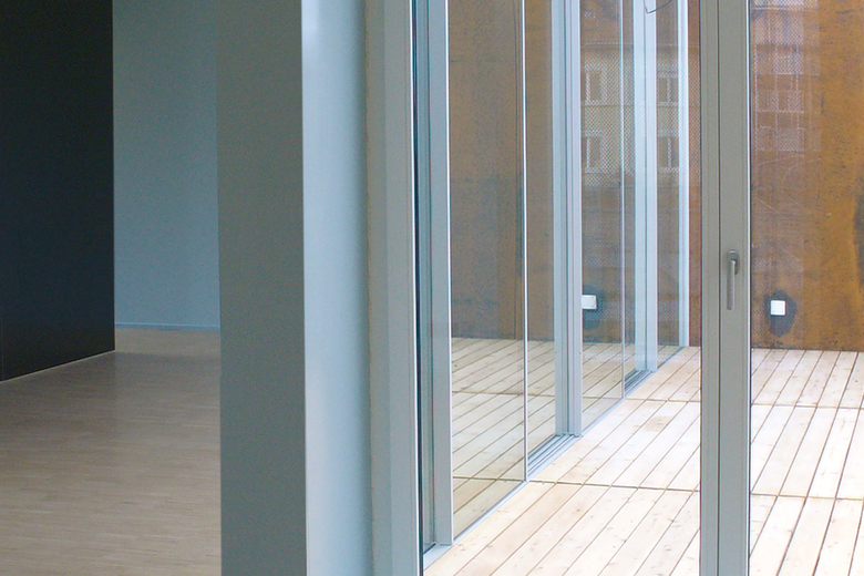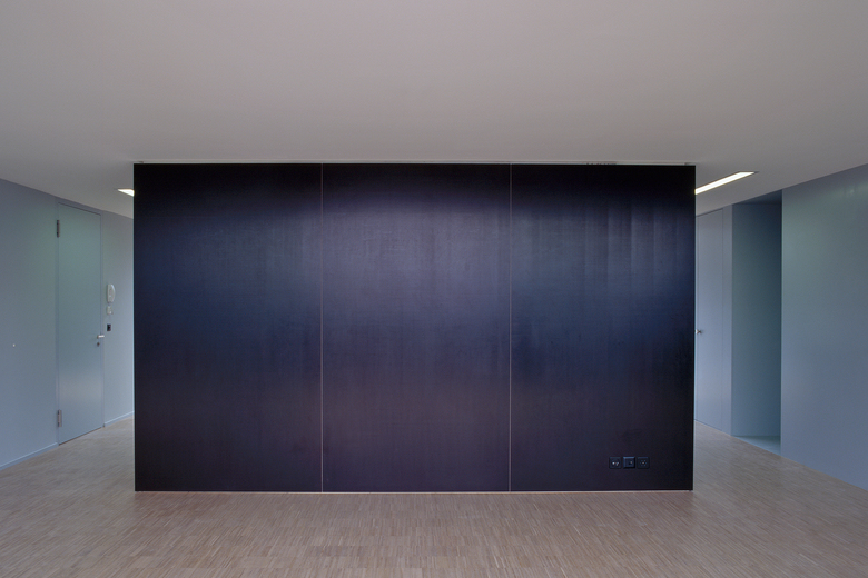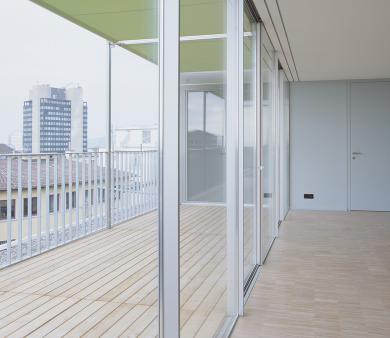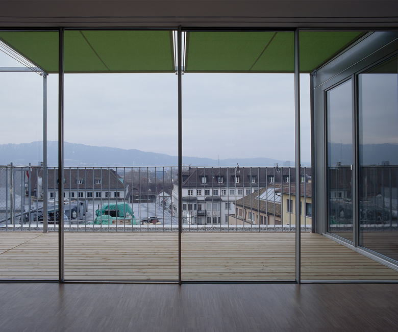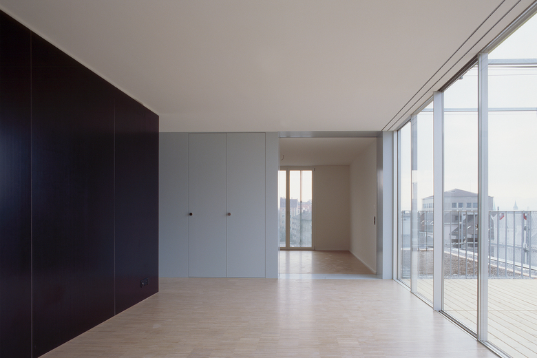 Die 2 neuen Loftwohnungen schweben über den Dächern von Zürich. Ein Ort mit Blick über die Stadt, den See und auf die Alpen. Der nahezu quadratische ungerichtete zentrale Wohnraum wird durch eine Sanitärinsel in einen Koch-, Ess- und einen Wohnbereich zoniert. Die Raumabfolge ist fliessend. Die Wohnungen weiten sich auf die Stadt. Die Glasmembran (Skyframe Verglasungen) verschwindet vor der Silhouette der Stadt. Aussen- und Innenraum verschmelzen.