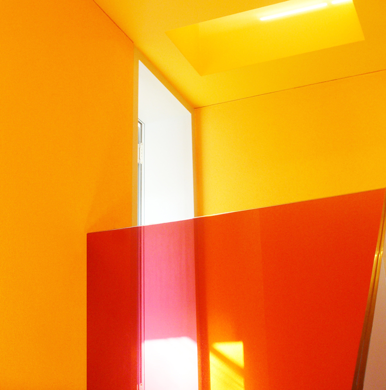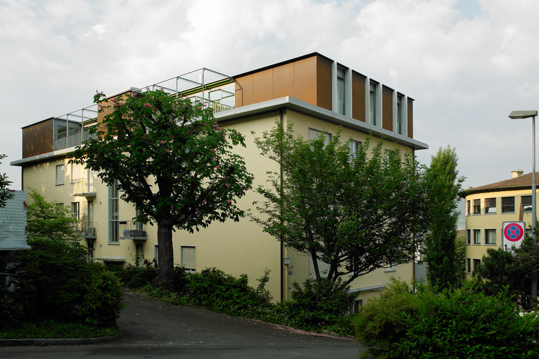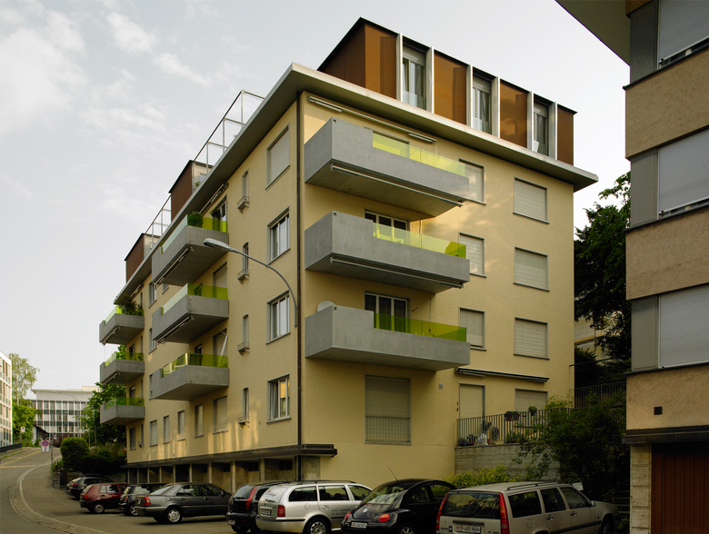 Bei der Sanierung der Aussenhülle wurde versucht, den Charakter des Hauses durch wenige, gezielte Säuberungen zu verstärken. Einzig die neuen Balkone und der Dachaufbau kontrastieren die Architektur der fünfziger Jahre als klar ablesbare Elemente unserer Zeit. Das die beiden Generationen verbindende Treppenhaus erstrahlt in einer neuen Farbgebung.