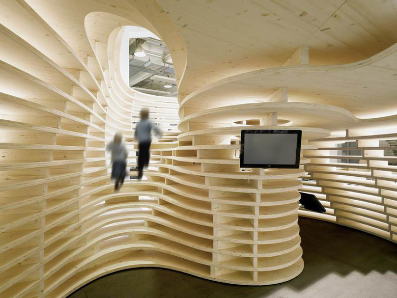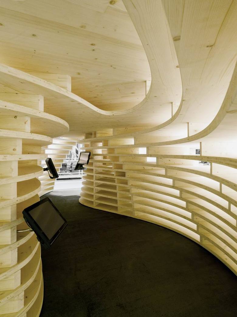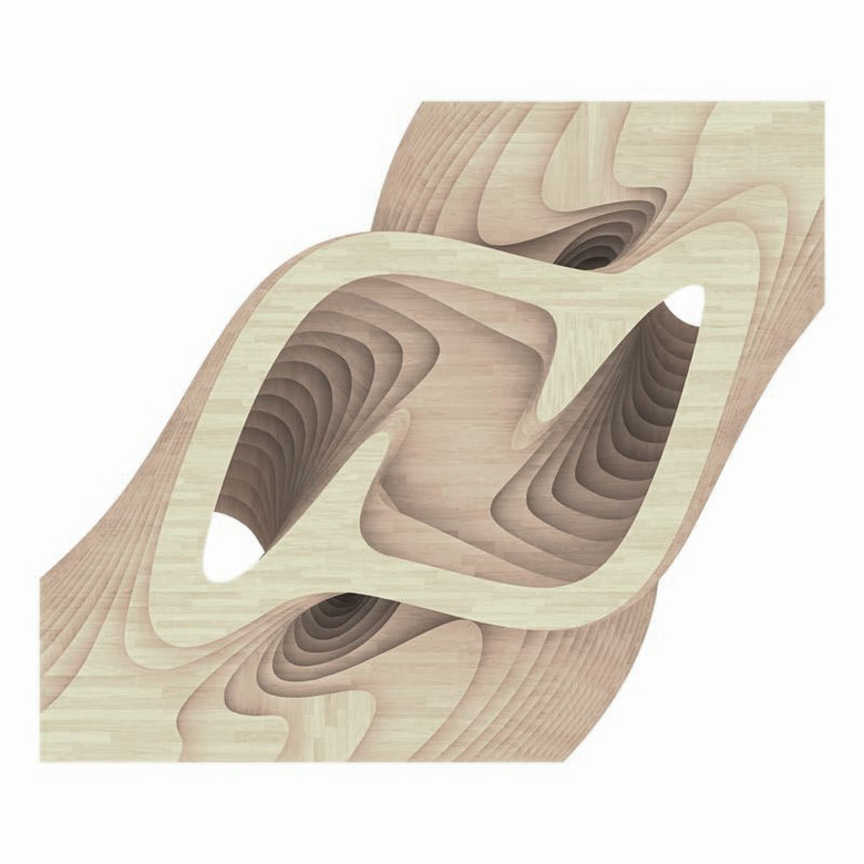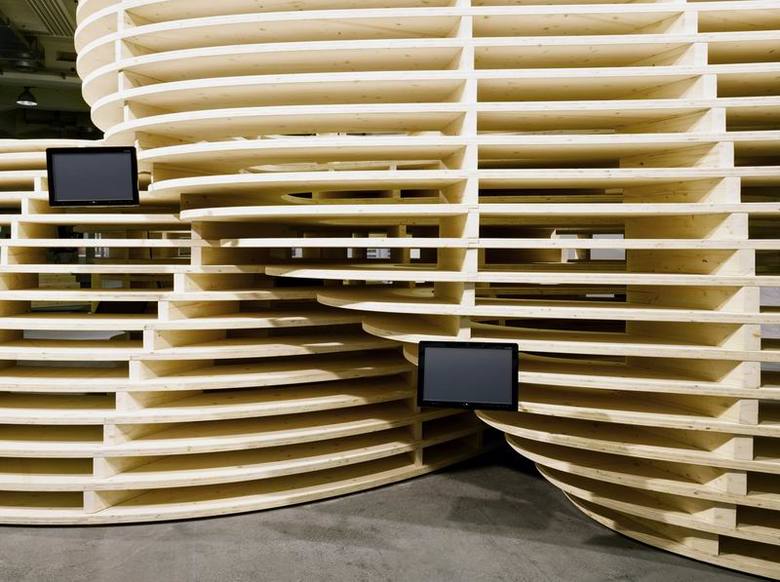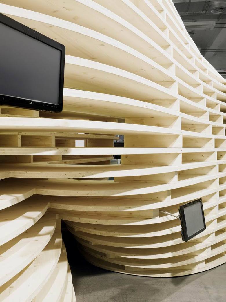 Zwanzig Ebenen aus 50 mm starken Fünfschichtholzplatten sind abwechselnd mit 13 cm hohen Distanzelementen desselben Materials aufeinandergestapelt. Mit Absicht sind die Distanzelemente nicht zurückversetzt, sondern bündig zu den horizontalen Schichten angeordnet. So erinnert die Struktur an vertraute Dinge, an traditionelle Holzbauten, an Regale oder gestapelte Paletten anstatt ein stromlinienförmiges Designobjekt zu schaffen.