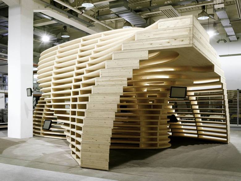 Die organisch geformte Holzskulptur aus mehrlagigen Massivholzplatten führt die Besuchenden in der Figur einer „räumlichen Acht” durch fließend ineinander übergehende Räume. Die Raumschleife erschließt sich aber erst, wenn man sich durch den gewundenen, höhlenartigen Bereich oder über die kleine „Terrasse” darüber bewegt, die auch Sitzgelegenheiten für Verschnaufpausen bietet. Um die Form flexibel in unterschiedliche Umgebungen einpassen zu können, schaffen Übereck-Öffnungen Bezüge nach allen Richtungen. Je nach Blickrichtung und -distanz wechselt auch der architektonische Ausdruck der Konstruktion zwischen transparenten, durch Wangen getragenen Schichten, einer terrassenförmigen Topographie und einem bulligen Holzkörper.