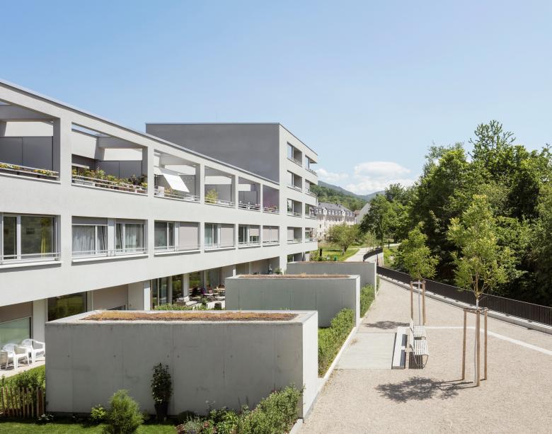 Kontext – Das bislang unzugängliche altlastenverunreinigte Areal des alten städtischen Bauhofs wird zu einem qualitätsvollen Quartier für zentrumsnahes genossenschaftliches Wohnen umgewandelt. Eingefügt zwischen stark befahrener Bundesstraße im Norden, dem attraktiven Freiraum entlang der Oos im Süden und der unmittelbar angrenzenden denkmalgeschützten Ooswinkelsiedlung von Paul Schmitthenner erfolgt hier ein Stück Stadtreparatur.