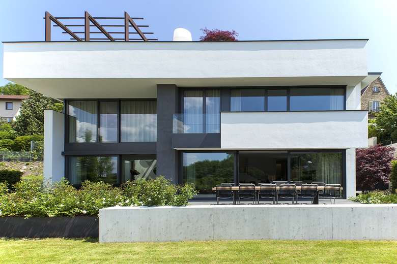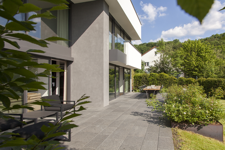 Durch den zurückversetzten Gebäudeteil wirkt das Haus zur Straße hin kleiner als es in Wirklichkeit ist. Die Garage samt Untergeschoss befindet sich unterhalb der Gartenebene.