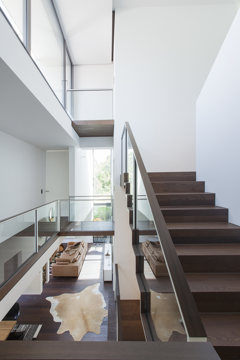 Im Herzen des Hauses verbindet ein 3-geschossigen Luftraum die beiden Gebäudeteile miteinander, aus jeder Etage entstehen Blickbeziehungen zueinander. Der Luftraum wirkt wie ein großer Raum, das Tageslicht fällt von oben herab, durch den Lauf der Sonne wechseln sich die Lichtstimmungen während des Tagesverlaufs im Herzen des Hauses ab.