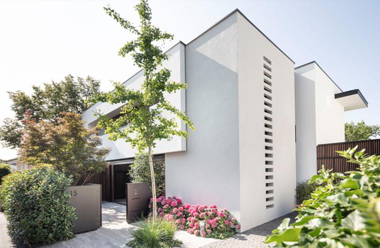 Aus dem Wunsch, das Haus der Kindheit zu erhalten, entstand aus dem unscheinbaren 60er Jahre-Bau mit Satteldach ein Familiensitz mit sagenhaftem Blick über die Stadt. Die neue, dreigeschossig verglaste Südfassade öffnet das Haus zur Sonnenseite hin und gibt den Blick ins lichtdurchflutete Innere frei. Alle Wohnräume sind rund um die zentrale, frei schwebende Treppe konsequent gen Süden ausgerichtet. Geschosserhöhung, begrünte Flachdächer und die kubistische Formensprache der Fassade – das Konzept interpretiert den Charakter des Hauses neu, ohne seine Seele zu verlieren. Die neue Raumaufteilung bietet genug Platz für Kinder und Enkelkinder und gleichzeitig ausreichend Rückzugsnischen.