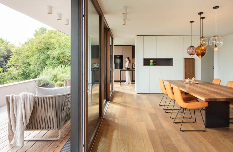 Neben dem Einsatz von vorrangig warmen Materialien wie Holzlamellen-Elementen, goldbraun gebeiztem Eichenparkett, Muschelkalk und handgefertigten Fliesen verleiht die Vergrößerung der Gartenfläche zur Südseite hin und die Bepflanzung des Steilhangs dem Gebäude auch emotional einen großen Mehrwert.