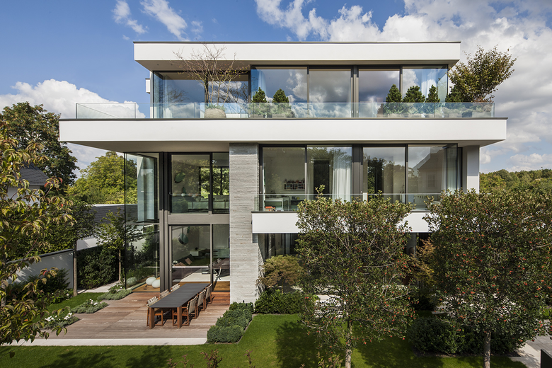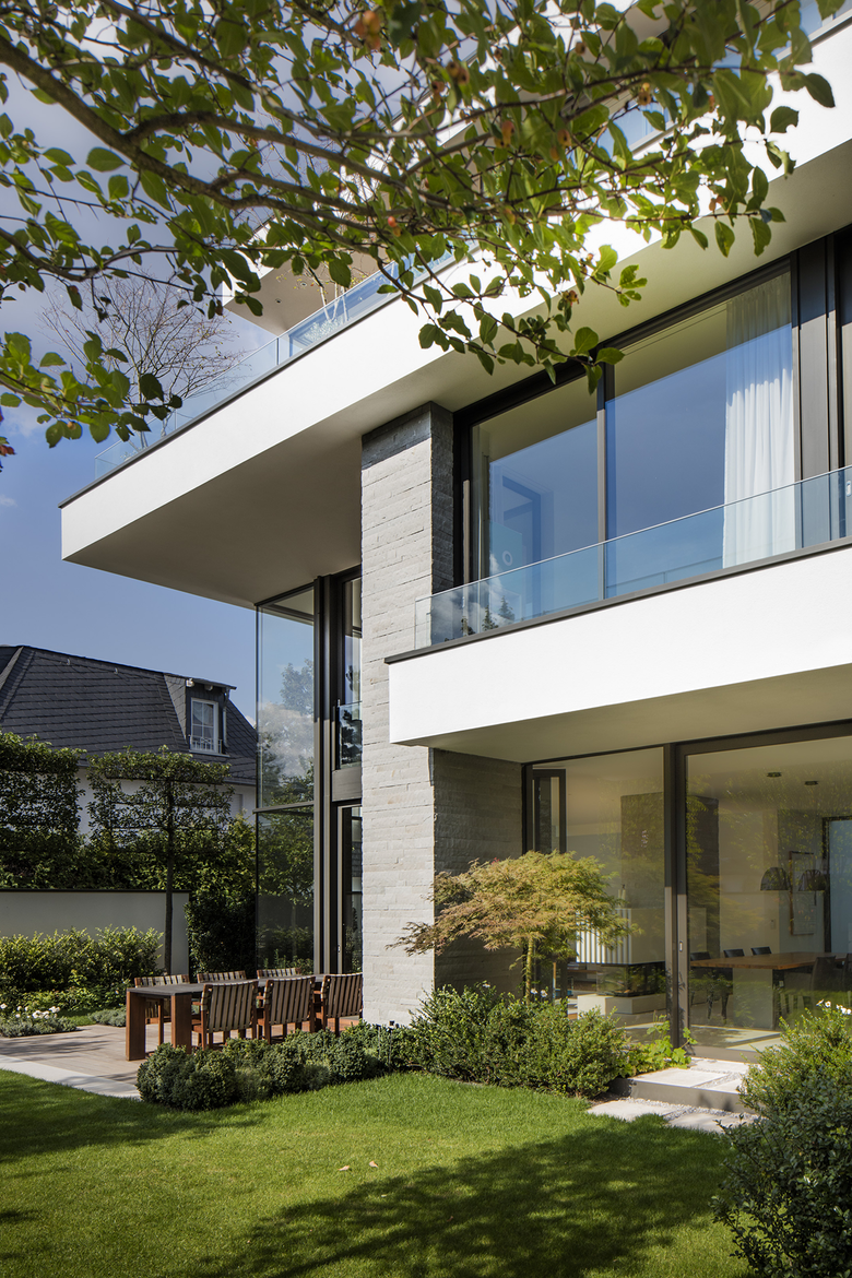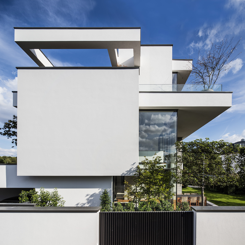 Das Spiel der Gegensätze prägt auch das Exterior: Massiver Stahlbeton trifft auf filigrane Verglasungen, weiße Brüstungswände auf dunkle Aluminium-Lamellen, heller und dunkler Putz im Wechselspiel der Kontraste. Im Interior werden natürliche, warme Materialen wie edles Walnuss Parkett und Kalkstein Wände mit kühlem Edelstahl und Glas zu einem modernen, lässigen Gesamtbild kontrastiert. Die klare Formensprache, eingebettet in viel Grün und das offene Lichtkonzept tun ihr Übriges, um die Grenzen zwischen innen und außen aufzuheben und dem Wohnraum Größe und Weite zu verleihen.