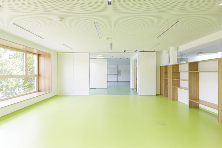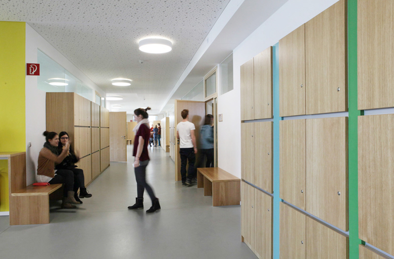 Jedes Geschoß hat einen großen Außenbereich als erweiterten Lernbereich. Die zentrale Bibliothek im Erdgeschoß wird in den neuen Lesehof erweitert. Im ersten Stock verbinden sich die Lerninseln der Aufenthalts- und Pausenräumen samt Sonnenbalkon mit den Ruhe- und Kommunikationszonen. Die begehbare Dachterrasse im zweiten Stock wird als "Frei-Luft-Raum" für Lehre und Lernen im Freien gestaltet.