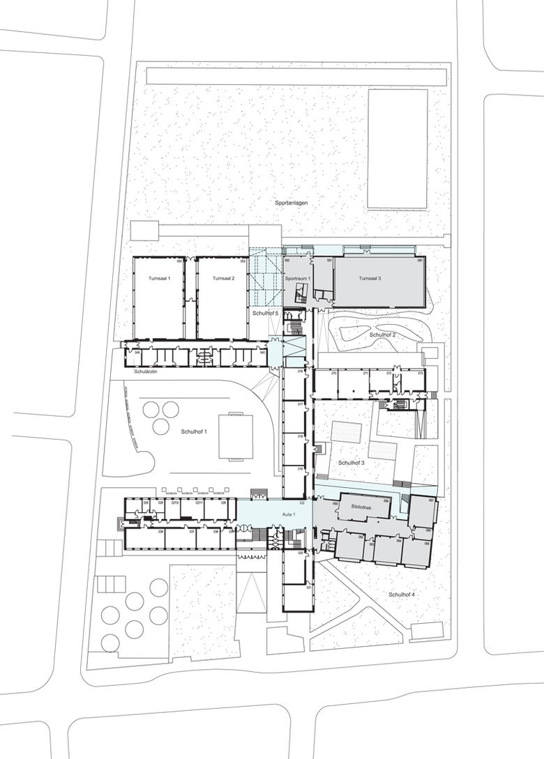 Eine leichte Drehung des Klassentrakt-Neubaus öffnet den "Lese-Hof" zur Umgebung und zur Sonne. Je Geschoß ordnen sich vier Unterrichtsräume (mit großzügigen Fensternischen) rund um freiere Schulräume ("Schalträume") und Pausennischen zu einem Cluster an. Das Grundrisskonzept mit zuschaltbaren "Modulräumen" zwischen den Unterrichtsräumen erzeugt veränderbare Räume, die Mehrfachnutzungen hinsichtlich neuer pädagogischer Konzepte und zukünftiger Entwicklungen ermöglichen, sowie neue Raumtypen in Richtung Ganztagsschule bietet. Durch das flexible Wand- und Raumsystem lassen sich (im Gegensatz zur starren Schule der 60er Jahre, die aus Gang und Klassenzimmer besteht) Räume verschiedener Größen - von 15m2, 30m2, 65 m2, 80m2 bis 145m2 - bilden.