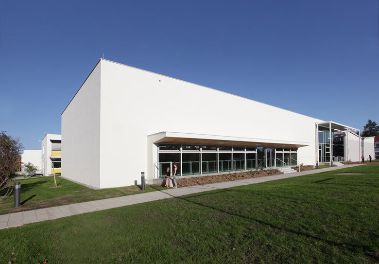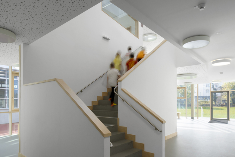 Entlang der Fassaden wird das Wechselspiel zwischen Außen und Innen zur gestalterischen Leitidee: Im Norden schieben sich Fensternischen weit nach außen und schaffen Raum im Inneren, im Süden vertieft sich die Fassade und schafft Balkone und überdachte Terrassenbereiche, die ein Lernen im fließenden Übergang zwischen Außen und Innen möglich machen.
