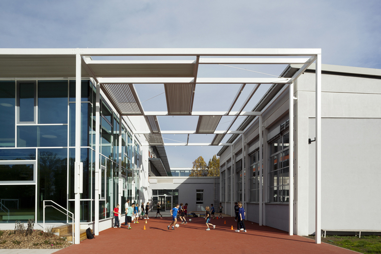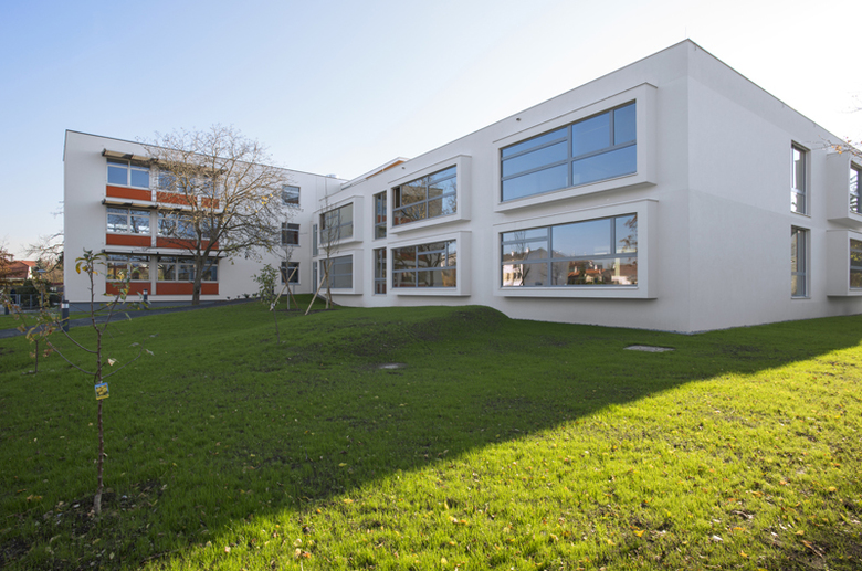 Dem bestehenden Schulbau, erbaut 1962-64, nach Plänen von STEINFELDER/JAKSCH Architekten wurden durch GABU Heindl Architektur zwei neue Bauteile angegliedert, die den offenen Kreuzgrundriss der Schule fortsetzen, jedoch neue Raumformen und Raumgrößen einführen: ein Klassentrakt in Form von Clustern mit flexibler Groß- und Klein-Raum-Nutzung sowie ein neuer Turnsaaltrakt mit klassischer Halle, kleineren Sport-Pausenräumen und einem Außen-Turnsaal in Form einer bekletterbaren Pergola. Durch die zwei Zubauten wurden fünf neue unterschiedlich programmierte und gestaltete Schulhöfe geschaffen.