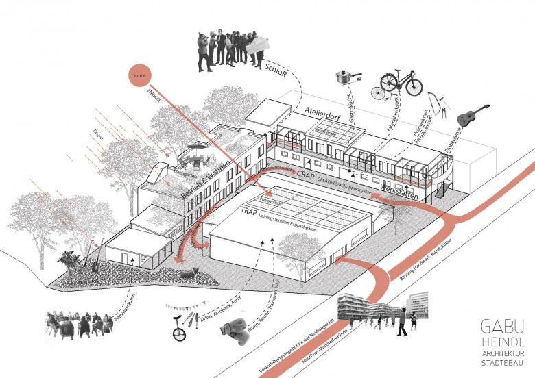 Mit dem Kauf des Grundstücks inkl. Turnhalle, Betriebsflächen und Wohnungen haben sie viel vor: Sie wollen hier nicht nur ihr eigenes Süppchen kochen, sondern auch für Nachbar*innen und andere Projekte leistbare Räumlichkeiten schaffen – vergleichbar mit dem WUK und der Sargfabrik in Wien oder dem Willy-Fred in Linz. Und genau an solchen Freiräumen mangelts an allen Ecken und Enden.