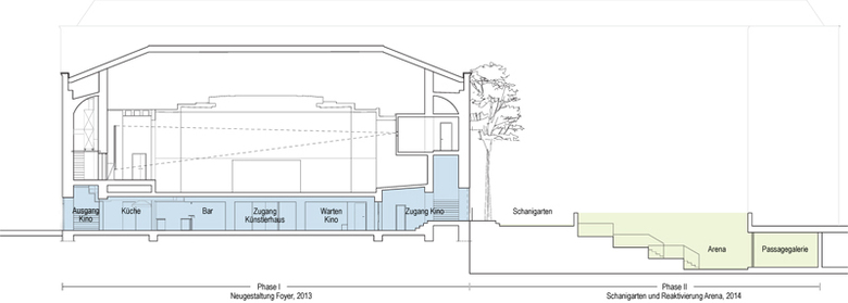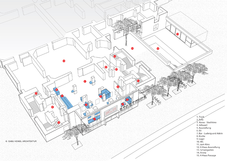 Das architektonisch-urbanistische Konzept (angelegt auf mehrstufige Fertigstellung) geht das Stadtkino-Foyer als einen betont öffentlichen Raum an; dies auch im Sinn von Gesten des „Reingehens“, nicht zuletzt durch das „Reinziehen“ der Straße, der exemplarischen Form transitorischer Urbanität, ins Foyer in Gestalt des grauen Bodenbelags; oder auch durch das „Raussetzen“ von Teilen des Foyers in Form eines Schanigartens in ein bislang totes Eck.