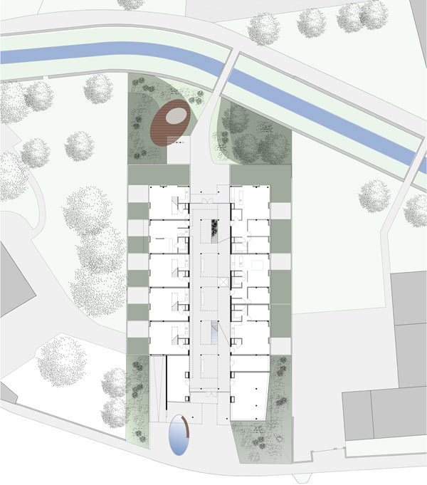 Das vorliegende Projekt nutzt seine Lage zwischen Eisentorgasse und Mödlingbach, indem es eine Verbindung zwischen den beiden Erschließungsachsen schafft und den Bach in das städtebauliche Konzept integriert. Die städtebauliche Ausrichtung des Gebäudes erlaubt eine attraktive innere Erschließungszone welche im Süden über einen großzügigen Vorplatz an die Eisentorgasse anbindet. Im Norden verbindet eine neue Brücke über den Mödlingbach die begleitende Promenade mit dem Gebäude.
