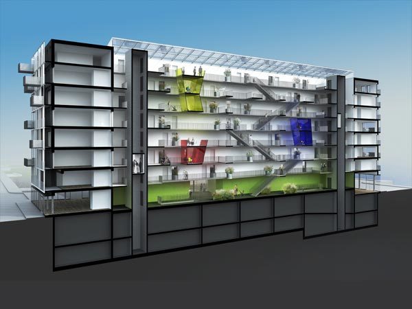 Eine hallenartige Grundstruktur in allen Geschossen ermöglicht hohe Flexibilität und leichte Veränderbarkeit der Nutzung und Größe der Mieteinheiten.