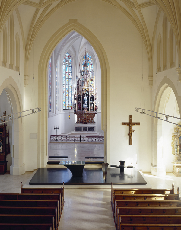 Die asymmetrische Öffnung des Presbyteriums zum Hauptschiff wird in der liturgischen Neugestaltung mit einbezogen. Durch die symmetrische Ausrichtung zum Langhaus wird das historische Kreuz im Altarraum aufgegriffen – das Kreuz wird Teil des Altarraums.