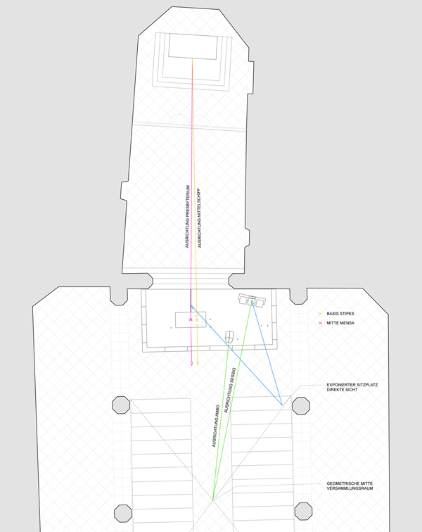 Ambo und Sessio sind zur geometrischen Mitte des Versammlungsraumes ausgerichtet.