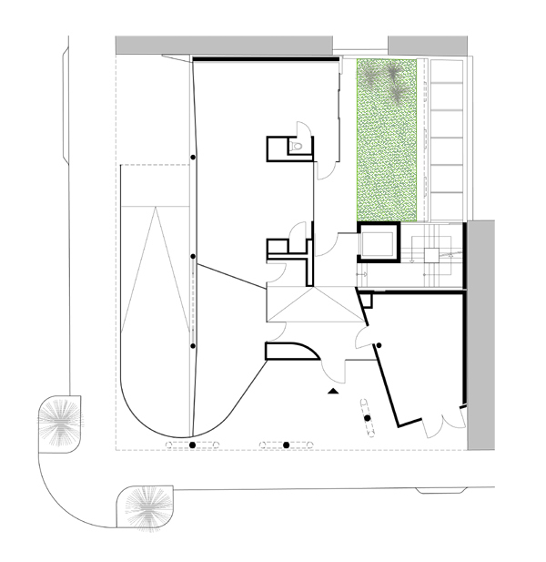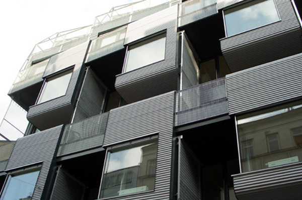 17 Wohnungen, vorwiegend zweigeschossig organisiert, bilden die Struktur des Hauses. Die hohe Dichte des Wohnraumes, hervorgerufen durch die städtebauliche Disposition des Grundstückes an der Blockecke, wird durch die Planung eines großzügigen, allen Bewohnern zur Verfügung stehenden Nutzraumes kompensiert. Die Erdgeschosszone wird baulich transparent behandelt und freigehalten für gemeinschaftliche Bereiche, (Kinderspielraum, Werkstatt, Hobbyraum,…) – ergänzt durch einen von allen Bewohnern zugänglichen bepflanzten Dachgarten.