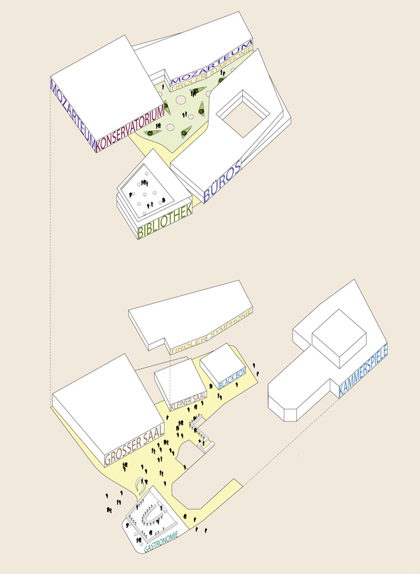 Das Haus der Musik respektiert die Bedeutung des Landestheaters durch ein leichtes Zurücksetzen und Ausschwenken des Baukörpers in diesem Bereich. Gleichzeitig wird die Lage der Naturdenkmäler respektiert und besonders die Säuleneiche in die Gesamtkonzeption integriert.