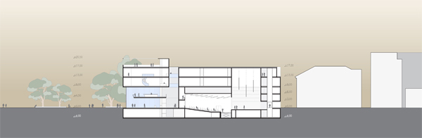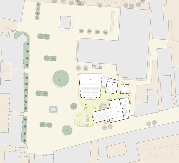 Die prominente Lage und die qualitätsvollen Gebäude in der unmittelbaren Nachbarschaft erfordern einen sorgfältigen Zuschnitt der neuen Bauvolumen. Die flächenmäßige Ausdehnung des Hauses der Musik reagiert auf die Volumen der benachbarten öffentlichen Gebäude; die Gliederung der Baumassen folgt der Maßstäblichkeit der östlich angrenzenden Baukörper.