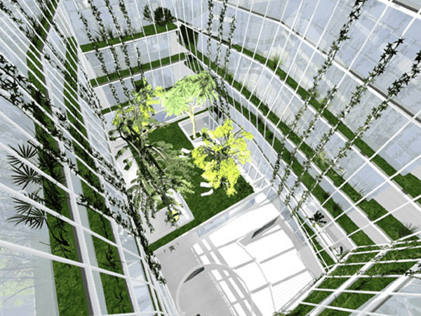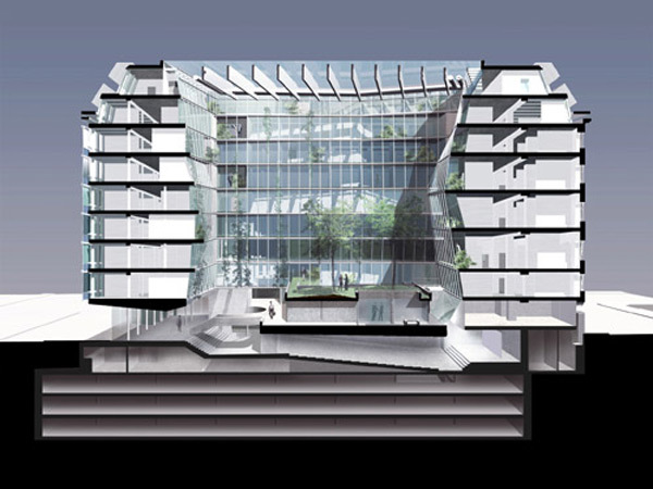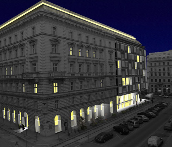 Die Neukonzeption der Zentrale der Österreichischen Volksbanken AG erforderte die sensible Gestaltung eines zeitgemäßen Bürogebäudes im Kontext der historischen Bausubstanz, die aus Rücksicht auf das Weltkulturerbe in neue Strukturen miteinbezogen wurde. Die öffentlichen Bereiche, wie etwa das zentrale Kundencenter im Erdgeschoss, oder der multifunktional nutzbare Konferenzsaal im Souterrain, sind von der Eingangshalle aus gut überschaubar. Das begrünte Atrium bildet das kommunikative Herz des Gebäudes. Vom 1.OG bis ins 2.DG bilden begehbare Grünzonen mit der vertikalen Bepflanzung des Innenhofes eine dreidimensionale Landschaft mit hoher Aufenthaltsqualität. Die freien Grundrisse der Bürogeschosse (mit 852 Arbeitsplätzen) lassen vielfältige Kombinationen von Zellen- und Kombibüros zu. Variable Trennwände gewährleisten dabei optimale Reaktionen auf sich verändernde Raumkonstellationen.