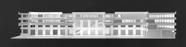 Ein flacher Neubau überlässt mit seiner niederen Gebäudehöhe dem stehenden, höheren Hauptverwaltungsgebäude seine dominante Bedeutung. Die gewählte Gebäudestruktur erlaubt bei Bedarf eine einfache Erweiterung nach Süden.