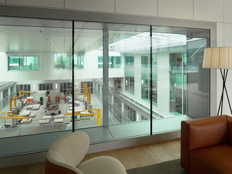 Die enge Vernetzung von Produktion, Forschung und Dienstleistung in einem Gebäude ist Grundlage des Raumkonzeptes und entspricht dem Anspruch der Firma Hilti. Herz der Anlage bildet die überhohe, stützenfreie Versuchshalle, welche einen optischen und funktionalen Beziehungsreichtum erzeugt.