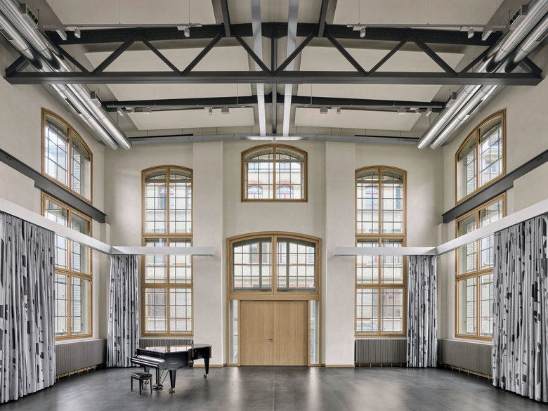 Die denkmalgeschützte Kraftzentrale trägt als Zeitzeuge zum Gleichgewicht zwischen Alt und Neu auf dem vonRoll-Areal bei. Als neues Musikhaus erlaubt das Saalfoyer eine öffentliche Durchwegung im Zentrum des zukünftigen Campus.