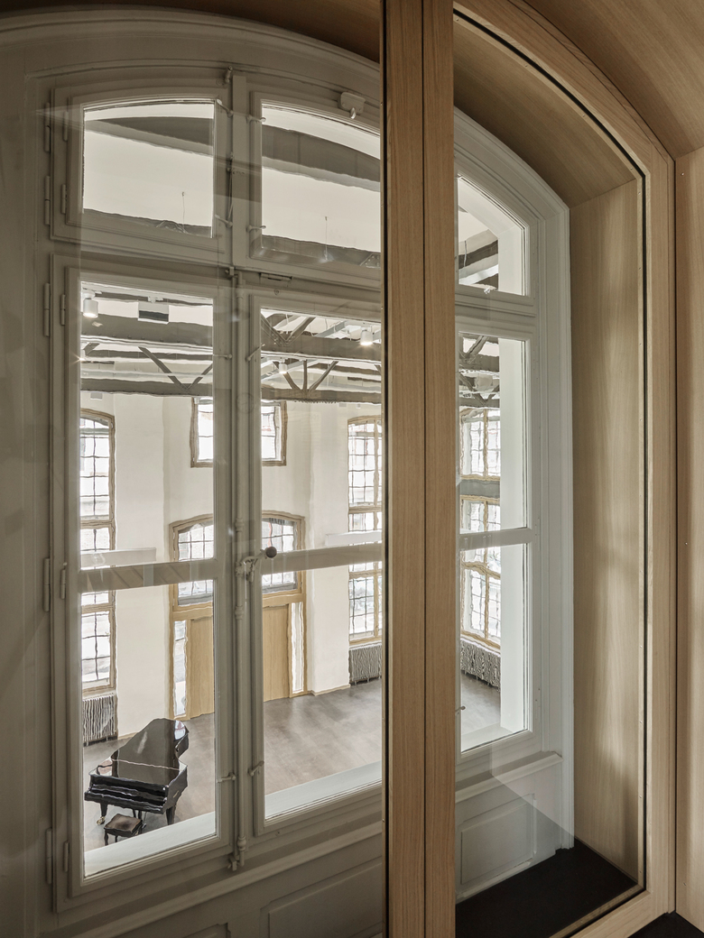 Zwischen bestehender Gebäudehülle und der neuen tragenden Raumfigur im Inneren werden Musikräume als schalloptimierte Kammern ausgebildet. Durch die Integration der Steigzonen rhythmisieren die Innenwände die Gangräume.
