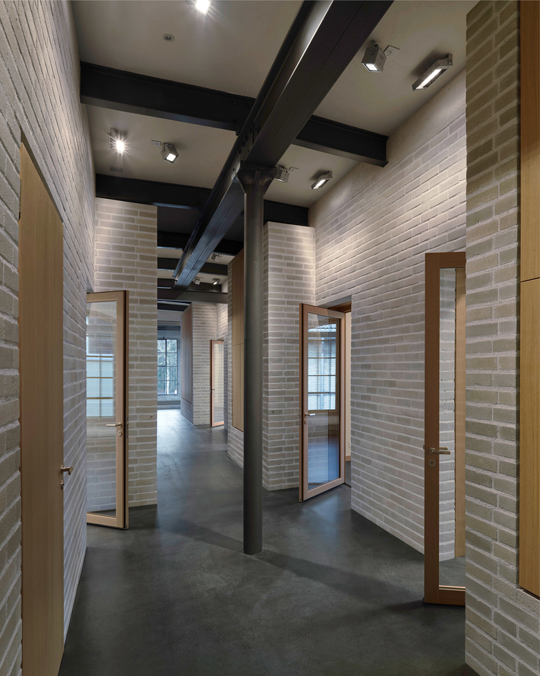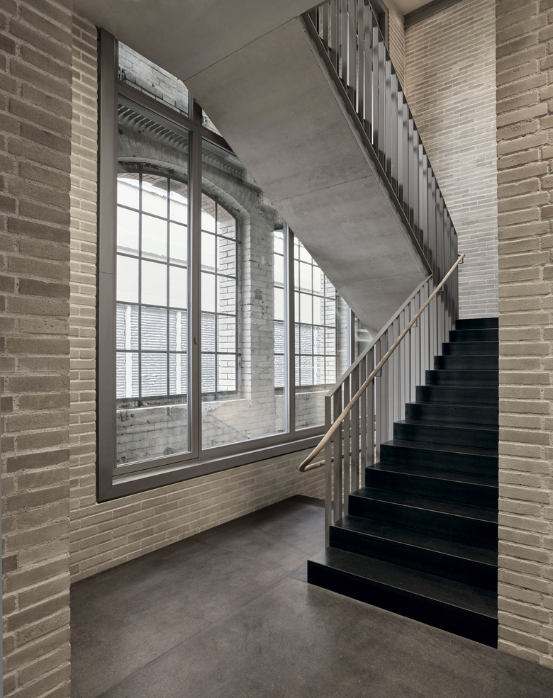 Vorgespannte, verschieden farbene Zementsteinwände leisten die Erdbebenertüchtigung und erzeugen mit den hellen Fugen eine sinnliche Atmosphäre. Innen wird diese durch neue Naturholzfenster verstärkt, während die feingliedrigen, historischen Industrieverglasungen den industriellen Charakter nach aussen bewahren.