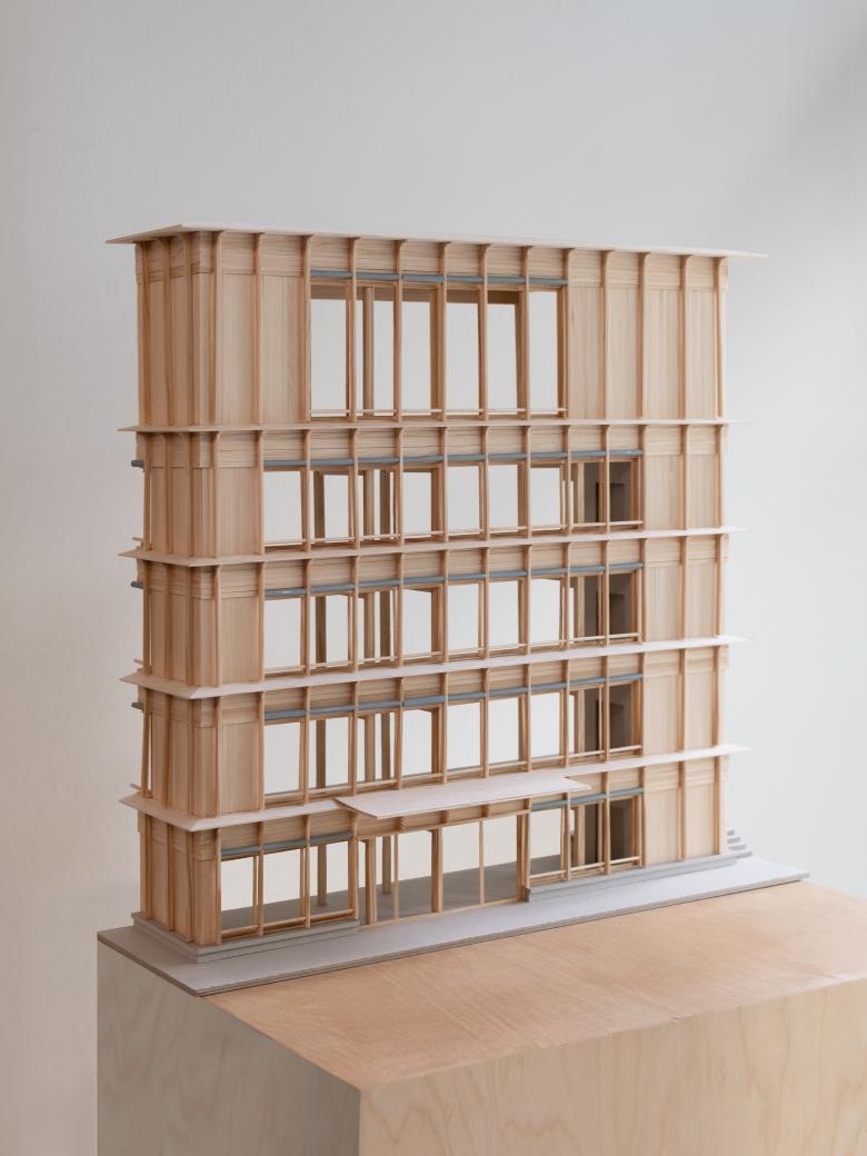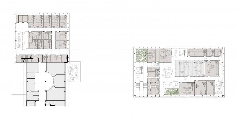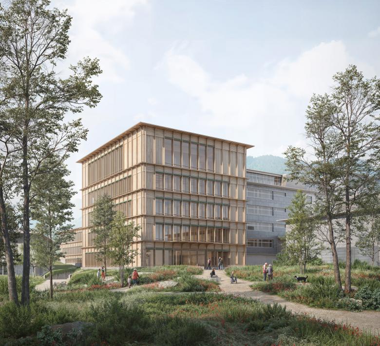 Das nachhaltige Holzbau-Projekt sucht in seiner Erscheinung hinsichtlich Gliederung und Öffnungsgrad Verwandtschaften zum Bestand und zeigt gleichzeitig eine klare konstruktive Struktur und innere wie äussere Materialisierung. Durch die Gliederung der mit Photovoltaik belegten Fassadenelemente entsteht ein interessantes Spiel aus Licht und Schatten, das dem Baukörper des Neubaus seine Leichtigkeit verleiht.