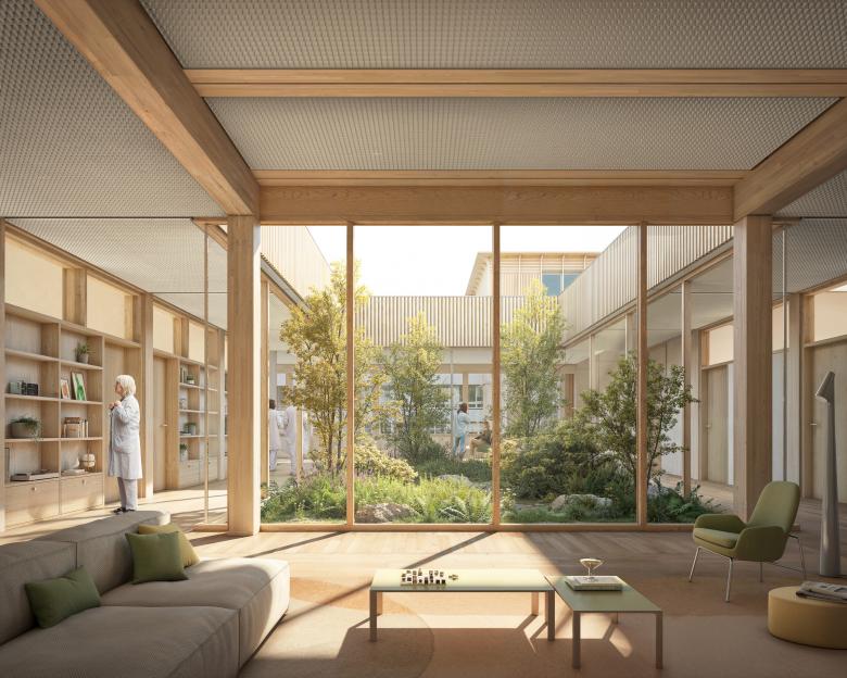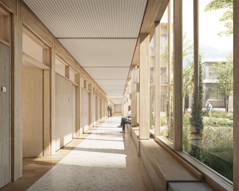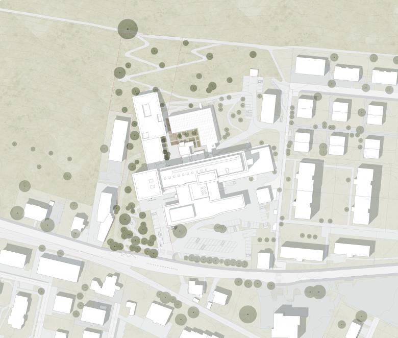 Der neu verortete Haupteingang des Spitals Nidwalden wird über einen grosszügigen Grünraum erschlossen, welcher die bestehenden Aussenparkplätze ersetzt und von dem aus der grosse Veranstaltungssaal und die Mitarbeiteroase als Abschluss der beiden Baukörper gut sichtbar sind.