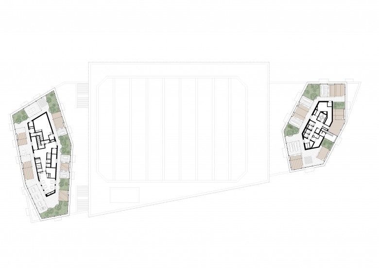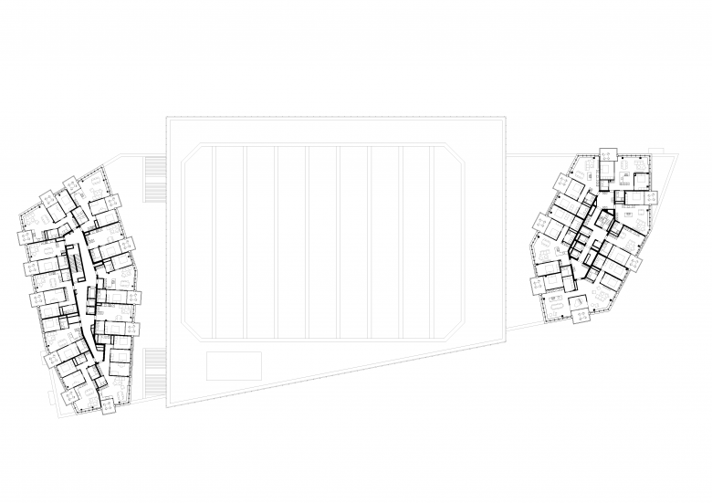Der Turm am Mattenplatz beinhaltet Mietwohnungen, der Turm am Bahnhofplatz kleine «Movement»- und grosse Eigentumswohnungen. Die polygonalen Umrisse geben den Gebäuden Schlankheit und bilden sinnvolle Raumbezüge zum Kontext. Im Innern erscheint die polygonale Form in den Tagesbereichen, während die Individualräume orthogonal und vielfältig möblierbar sind.
