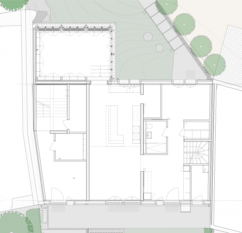 Die mittigen Tagesbereiche der grossen Wohnung der Eigentümer und der beiden kleineren Mietwohnungen sind übereinander angeordnet, als Raumplan organisiert und durchstossen das Gebäude von Norden nach Süden. Angrenzend sind beidseitig die Schlafzimmer, Bäder und Nebenräume mit normalen Raumhöhen ergänzt.